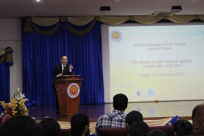 “Violence against women is not just done within 16 days. It needs more time and effort to make it happen and the choice to end violence against women starts with you, me and all of us,” said ProfessorKiengRotana, Vice President of Student Affairs.